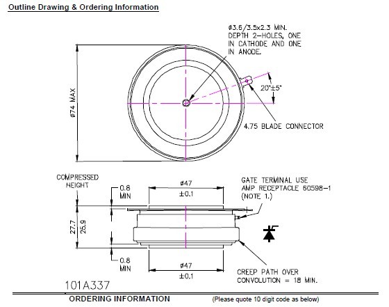 Features: (1)maximum peak on-state voltage: 1.9V; (2)threshold voltage: 1.207V; (3)slope resistance: 0.342mΩ; (4)critical rate of rise of off-state voltage: 200V/us; (5)peak off-state current: 150mA; (6)peak reverse current: 150mA; (7)gate trigger voltage: 3.0V.